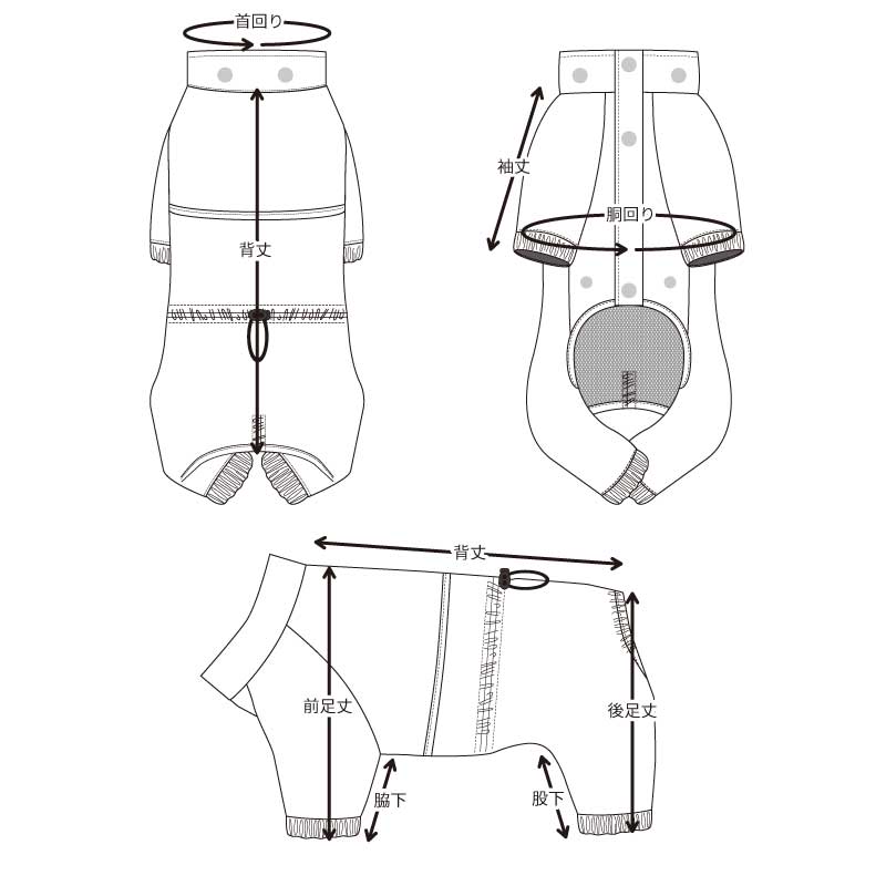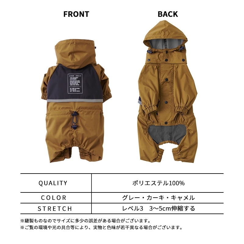 細部にまでこだわったデザインとシックなカラーがオシャレな、前開きタイプのレインウエアです。防水、暴風、透湿性、ストレッチなど、機能性も充実。雨の日や雪の日、山遊びなど、アウトドアシーンに最適の1着です。背中部分にはシンプルな「ミルスペック」をデザインしました。飼い主さんのお洋服とも合わせやすいので、さりげないリンクコーデも楽しめます♪尻尾の部分は丈調節が可能。お尻周りをしっかりホールドしてくれます。透湿素材を使用しているので蒸れにくく、着心地も快適。メッシュ生地不使用のため、爪が引っかかる心配もありません。ボタンで着脱する仕様になっています。長毛でも毛が絡みにくいので、安心&ストレスフリー♪ (※前丈調節ボタンは、右が"内側"留め、左が"外側"留めになっています。左右で折り方が異なります)反射テープやリードホールがついているので、外出先でも安心安全。ボタンで取り外し可能なフードが使いやすい♪ミルアウトドアシューズ(別売り:105R03)と合わせて、雨の日もオシャレに全身ガード!!(※5号〜8号には、ハンガー掛け用のループが足首回りについています。足首に絡まると危険ですので、ループは切ってご着用ください。)