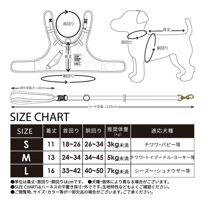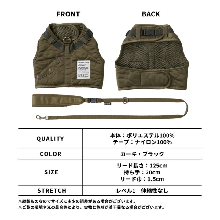フライトジャケットをイメージした、洋服感覚のハーネスです。全面のキルティングステッチや「ミルスペックデザイン」のオリジナル織ネームでミリタリー感がさらにアップ!首元にはすり抜け防止用のバックルストラップ付き。元気なワンちゃんにも安心してお使いいただけます。リードの持ち手は取り外しができるので、一時的な係留にとても便利。持ち手近くのDカンには、ボトルホルダーやマナーポーチ等、お散歩の必需品を掛けることもできます。首周りと胴回りのベルクロ(マジックテープ)を留めるだけの仕様なので、着脱も簡単。首元のバックルと合わせ、二重に体を固定することができます。表地には光沢のある素材を使用しています。フライトジャケットのリアルさに、とことんこだわりました。裏地にはクッション性のあるメッシュ生地を使用しています。体に優しくフィットするので、ストレスフリーな着心地です。