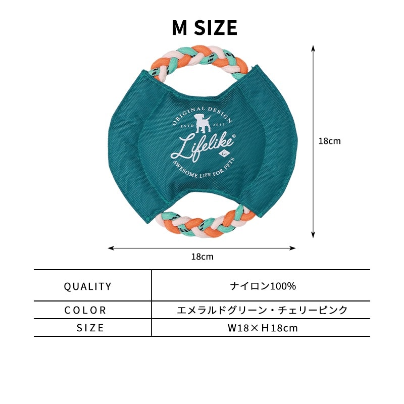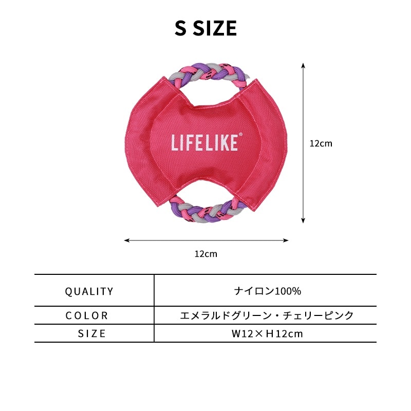 耐久性に優れたナイロン素材が嬉しい、パラコード編みのフリスビーです。カラフルな色合いと両面にデザインされたLIFELIKEロゴがポイント!小型犬、中型犬、大型犬とあらゆる犬種のワンちゃんにおすすめです。中心部には音の鳴る笛入り。飽きずに楽しく遊べるのも嬉しい♪噛むおもちゃは運動不足改善やストレス解消に◎屋内でもアウトドアでも、場所を選ばずに遊ぶことができます。汚れても水洗いができる、ナイロン素材を使用。長く清潔にお使いいただけます。