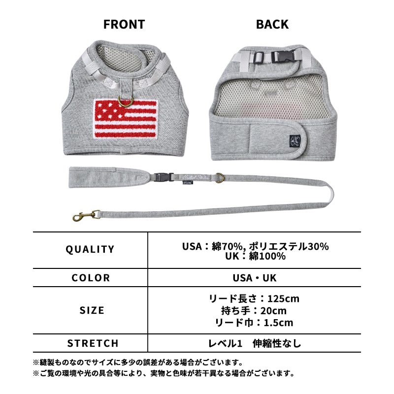 大きな国旗の刺繍がインパクト大!ベーシックな色味が使いやすいウェアハーネスです。立体感のあるサガラ刺繍で高級感も◎リードにはそれぞれの国旗の国名をプリント。筆記体のワンポイントデザインが可愛い♪首元にはすり抜け防止用のバックルストラップ付き。元気なワンちゃんにも安心してお使いいただけます。リードの持ち手は取り外すことができるので、一時的な係留にとても便利。持ち手近くのDカンには、ボトルホルダーやマナーポーチ等、お散歩の必需品を掛けることもできます。首回りと胴回りのベルクロ(マジックテープ)を留めるだけの仕様なので、着脱も簡単。首元のバックルと合わせ、二重に体を固定することができます。表地には柔らかいスウェット生地を使用しています。カジュアルなスタイルで肌触りも◎裏面にはクッション性のあるメッシュ素材を使用しています。ワンちゃんの体に優しくフィットしてくれるので、着用感も◎。フラッグポケットフィーディー(別売り:111W19)フラッグニットキャップ(別売り:112W06)と合わせれば、冬でも楽しくなるポップカジュアルスタイルの完成♪