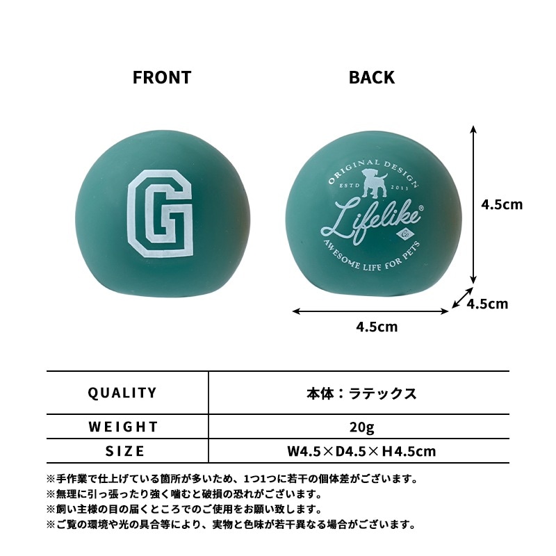 思わず全色集めたくなる!?それぞれのカラーの頭文字がデザインされた、ラテックス製のカラーボールです。あなたの推し色に合わせても◎。小柄なワンちゃんでも口にくわえやすい、コンパクトさと軽さが嬉しい!みんな大好き!高い音のなる笛入りで、ずっと遊んでいたくなる楽しさ♪背面には白でブランドロゴをデザイン。ボールのカラーリングを邪魔しないシンプルさが◎。弾力があり噛み心地の良い天然ゴムのラテックスを使用しています。ソフトな当たりで家具などを傷つけることがありません。家の中でも外出先でも安心して遊ぶことができます。