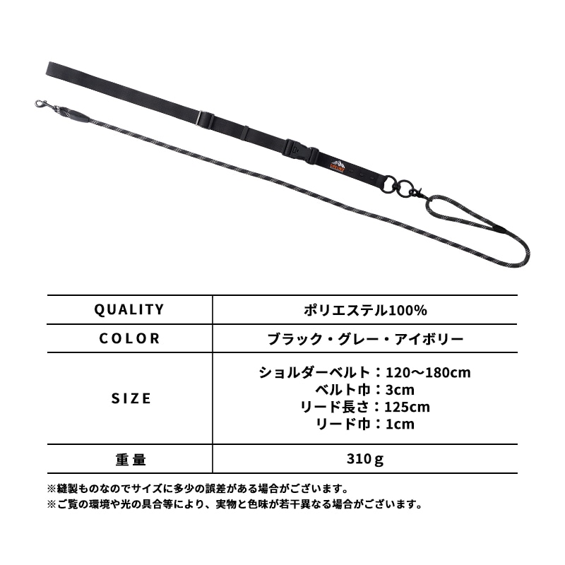 ベーシックなカラーがどんなスタイルにも合わせやすい♪LIFELIKEから、ハンズフリーリードが新発売です。両手が自由になるので、荷物を持ったり傘をさしてのお散歩も◎リードには登山やクライミングでも使われる、高強度のザイルロープを使用しています。マウンテンモチーフのオリジナル織ネームで、アウトドア気分もさらにアップ!回転カンを使用しているので、リードがねじれたり絡まったりする心配もありません。付属のバックルには二段階ロック機能がついています。簡単に外れない仕様で、ひっぱりの強いワンちゃんとのお散歩にも◎ロープリードの部分は取り外しが可能。単体の手持ちリードとしても使用できます。強度検査実施済みです。推奨体重は15kgまでとなります。※体重15kg以上のワンちゃんには使用しないでください。