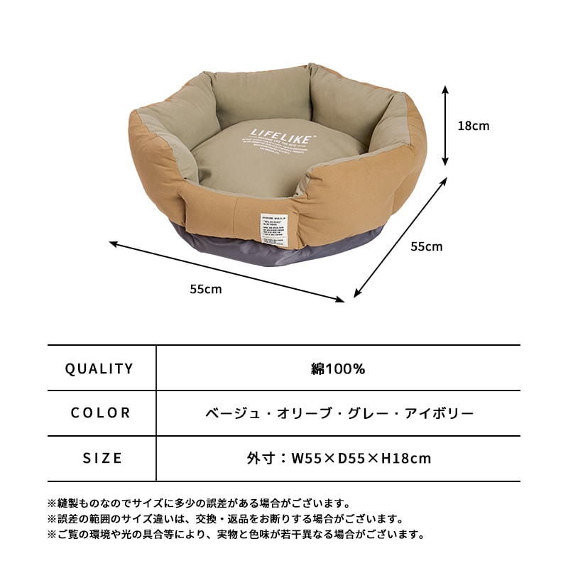 八角形の幅広設計でゆったりリラックス♪落ち着いたバイカラーデザインがお部屋のインテリアにも合わせやすい、春夏用ベッドです。ミルスペックデザインのオリジナル織ネームをワンポイントとして。ベッド全体のデザインを引き締めてくれます。ベッドの入口部分は高さを低く設計しているので、シニアちゃんや足の弱いワンちゃんにも優しいデザインになっています。たっぷりとした中綿がワンちゃんを優しく包み込んでくれます♪表地には綿100%の生地を使用しています。柔らかな肌触りで、通気性も◎。