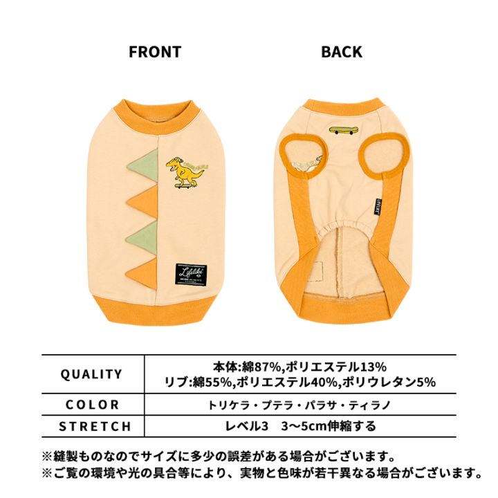 恐竜シリーズ最新作は、スケボー恐竜_立体背びれの最強コンビ!思わずお出かけが楽しくなる、かぶりタイプのお洋服です。ティラノ、トリケラ、プテラにパラサ、ゆるい表情もたまらない!首元のフロント部分にはスケートボードのイラストをデザイン♪正面からの写真でも、遊び心たっぷりな可愛さがしっかり伝わります。立体的で大きめデザインの背びれは、着るだけで恐竜に変身できちゃう優れもの!どこに行っても主役は君に決まり♪お腹周りはゴム入り、脇部分には伸びやかなリブを使用しているので、抜群の動きやすさ!元気いっぱいなワンちゃんにもおすすめです。パーカーやスウェット生地に使われる毛素材を使用しています。年間を通じて使いやすい生地感は、お出かけ用にもおうち時間にも◎