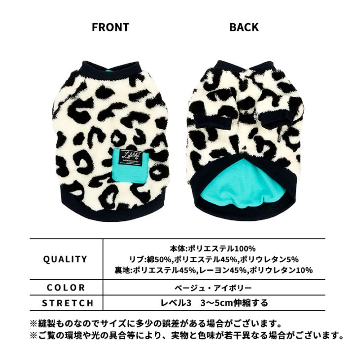 モコモコヒョウ柄_ネオンカラーの裏地&ポケットがインパクト抜群!派手かわいい存在感が寒さも吹き飛ばす、前開きタイプのアウター風お洋服です♪チラリと見えるネオンカラーの裏地がオシャレ!トレンドのラグランスリーブは、見た目にもとってもキュート♪ゆったり設計で肩や腕まわりの動きを妨げず、気いっぱいに走っても快適。厚手の生地でも窮屈感がなく、長時間のお出かけやお部屋でのリラックスタイムにも◎スナップボタン式の前開きタイプは、着脱も簡単。飼い主さんにもワンちゃんにもストレスフリーなー着です♪裏地には伸縮性のあるスムース素材を使用しています。やさしい肌触りで動きやすく、着心地も抜群!ふわふわモコモコのボア生地は、見た目にもとってもキュート♪抜群の手触りと保温性で、寒さからワンちゃんを可愛くしっかりガードしてくれます。