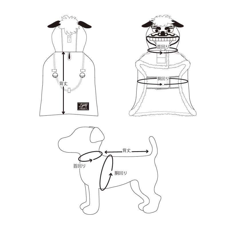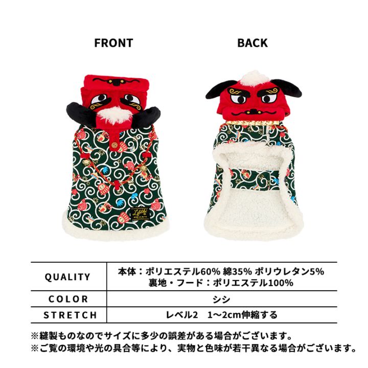 君にだったら噛まれたい♪お止月の定番・獅子舞デザインのポンチョで、新年の主役に!着せやすいポンチョタイプだから、初めてのお洋服としても◎首後ろにあるリードホールを使えば、お洋服を脱ぐことなくリードと首輪をつなぐことができます。フード留めがついているので、着用中に獅子舞の頭が前にかぶる心配もありません。着脱が簡単なポンチョタイプは、かぶりタイプのお洋服が苦手なワンちゃんにもおすすめの一着。ベルクロ部分には、毛が絡みにくい柔らかい素材を使用しています。唐草模様✕キュートなお正月モチーフは、見ているだけで幸せ気分に♪初詣や新年のご挨拶にもぴったり!裏地にはモコモコとしたボア生地を採用。抜群の保温性で、初詣も新年イベントも思いっきり楽しめちゃう♪新年を彩る華やかなアイテムが勢ぞろい!お友達やきょうだいワンちゃんとのペアルックで、映えるお正月に!(左から花舞晴れ着、雅袴、獅子舞唐草ポンチョ、お正月マフラーキャップ)