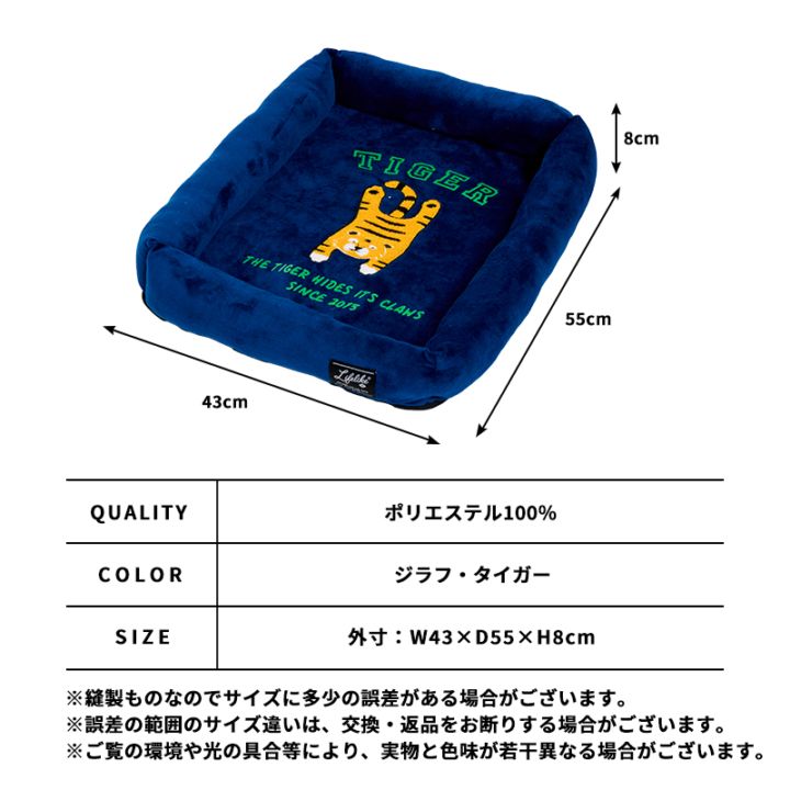 寝そべったタイガーとジラフ(キリン)がとってもキュート!低反発ウレタンのやさしいフィット感と程よい弾力でわんちゃんを包み込む、スクエア型べッドです。ふんわり中綿が入ったフチは、顎をのせてリラックスするのにちょうどいい高さ。立体感のあるサガラ刺繍でデザインされたアニマルは、ほっこり可愛く存在感たっぷり。本体にはふんわり感のあるポリエステル生地を使用しています。あたたかみのある質感で、秋から春先まで快適に使えます。冷えの気になる夏のエアコン対策にもぴったり♪見ているだけでみんな笑顔に♪寝そべりアニマルシリーズは他にもたくさん!寝そべりアニマルトレーナー(別売り:131W05)、寝そべりアニマルベルトはらまき(別売り:131R04)、寝そべりアニマルトイ(別売り:134R07)