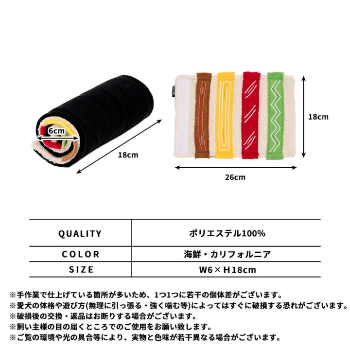 僕、私にもお寿司ちょーだい!華やかなハレの日気分を一緒に楽しめる、巻き寿司をイメージしたユニークなノーズワークマットです。遊び心満載のアイテムは、海鮮巻きもカリフォルニアロールも、どっちも揃えたくなる可愛さ!中をひらけばしっかり「寿司ネタ」が並びます♪切り込み部分にオヤツを隠せば、楽しいノーズワーク遊びの始まり!お鼻を使っておやつを探すノーズワーク。嗅覚を使うことでストレス発散、脳の活性化、運動不足解消にも効果が期待できます。手触りの良いソフトボア素材を使用。軽くてやわらかいから、当たっても痛くなく安心して遊べます。持ってこい遊びとノーズワーク、2WAYで楽しめる万能トイです。※柔らかい商品です。誤飲の危険がありますので使用時には目を離さないでください。大型のワンちゃんには与えないでください。
