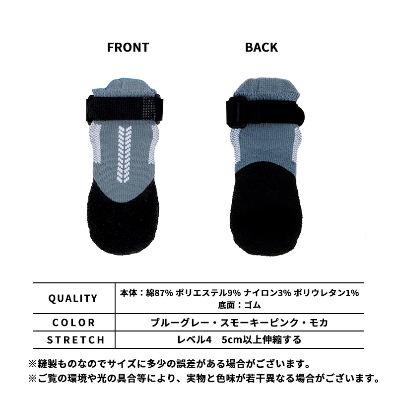 おしゃれなくすみカラーとシンプルデザインが使いやすい♪ワンちゃんの足元を優しくおしゃれに保護してくれるロング丈のラバーソックスです。アスフアルトや滑りやすい室内床対策、災害時の移動にも大活躍!足首まわりにはぐるりと巻き付けられるベルクロテープ付き。走り回っても脱げにくい仕様なので、元気なワンちゃんにも安心してお使いいただけます。グリップカの高いラバーソールを使用しています。地面からの肉球保護はもちろん、滑りやすいフローリングの床にも◎リブ仕様の履き口だから着脱もラクラク♪足をやさしく包み込み、動いてもズレにくい設計になっています。伸縮性抜群、フィット感のある薄手ニットは、季節を問わず使えるのが嬉しいポイント♪