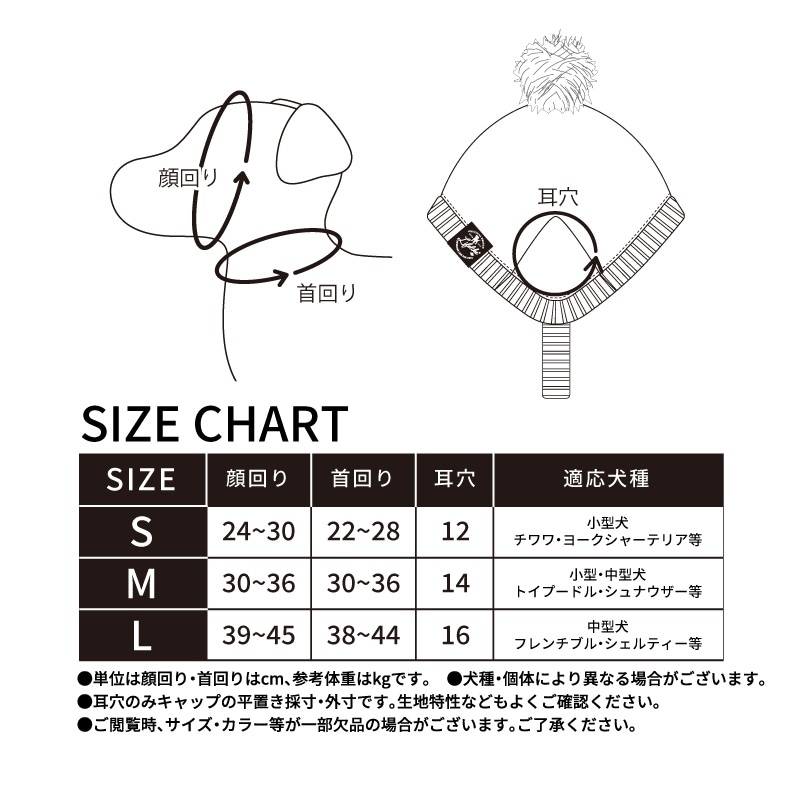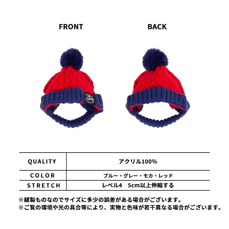 毎年大人気のニットキャップがリニューアルして新登場!フィット感UPで、ずれにくく安心◎ポップなバイカラーデザインで、寒い冬のオシャレがもっと楽しく♪耳穴に耳を通すタイプなので、安定感もバッチリ◎ブルブルしても外れにくくズレ落ちにくいデザインは、ワンちゃんも飼い主さんもストレスフリー♪伸縮性のあるニット素材のあご紐は、ぴったりフィットして動いても安心◎お顔周りにやさしいつけ心地です♪伸縮性のあるボリュームニットはふんわりあたたかく、高見え感も◎ポップなカラーと可愛いボンボンで、この冬の注目アイテムに♪同色系のおもちゃやウェアと合わせれば、映えること間違いなしのトータルコーデが完成!ハイネックシティーウォーム(別売り:131W01)、ベースボールボーントイ(別売り:134R06)