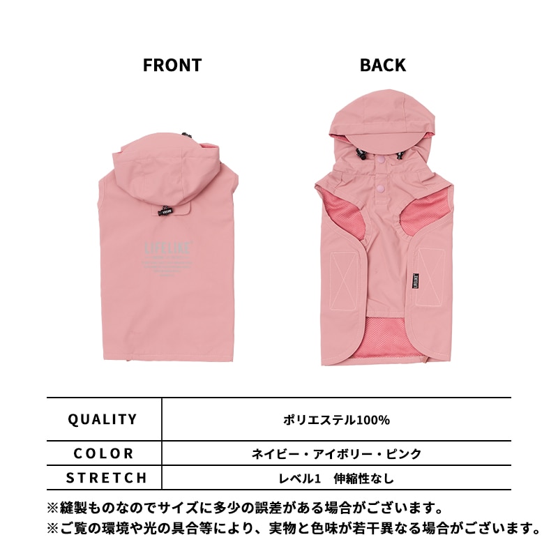 防水性・耐久性に優れたリップストップ生地を使用しています。雨の日のお散歩はもちろん、アクティブなシーンでも安心して着用できます。裏地には蒸れにくいメッシュ素材を採用。温度の高い雨の日でも、快適な着心地をキープします。