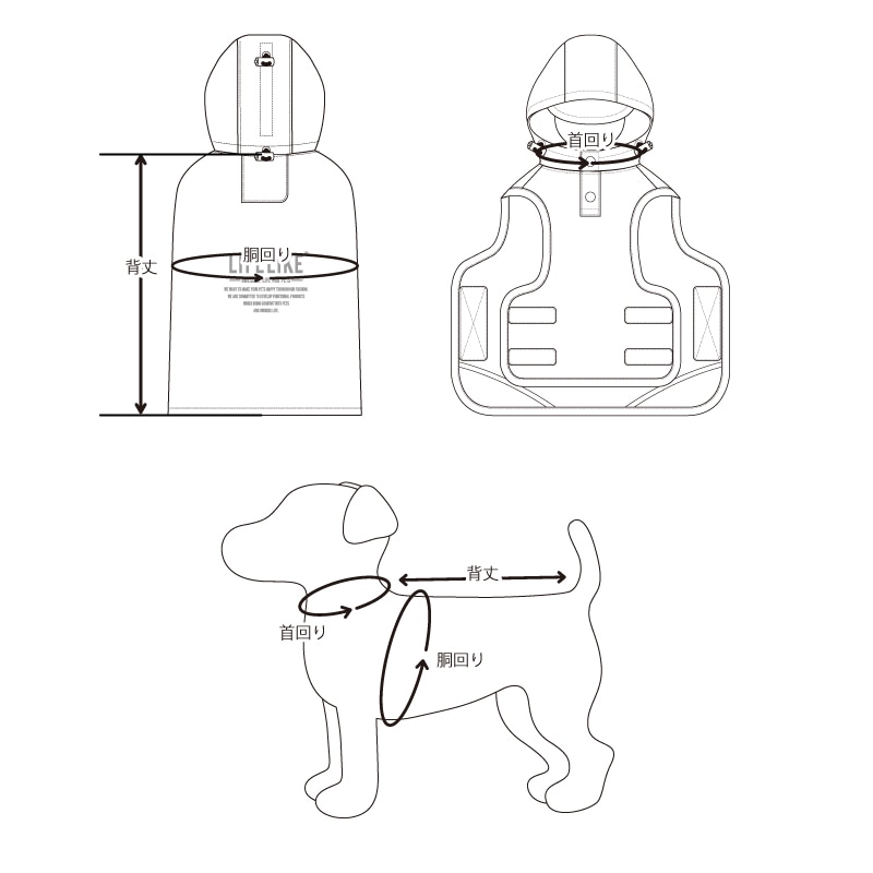 フードの頭部分にはアジャスター付き。丈の調節ができるので、ワンちゃんの頭の大きさに合わせて、快適な長さにフィットさせられます。首まわりと正面部分にもアジャスターが付いています。顔まわりを包み込むように調整でき、雨の入り込みを軽減します。