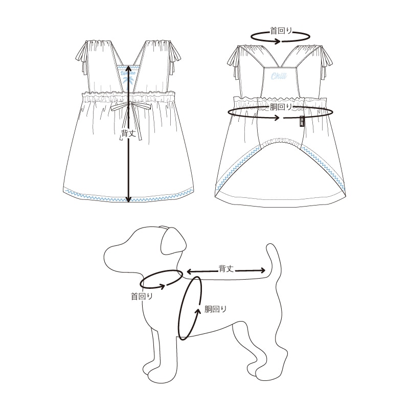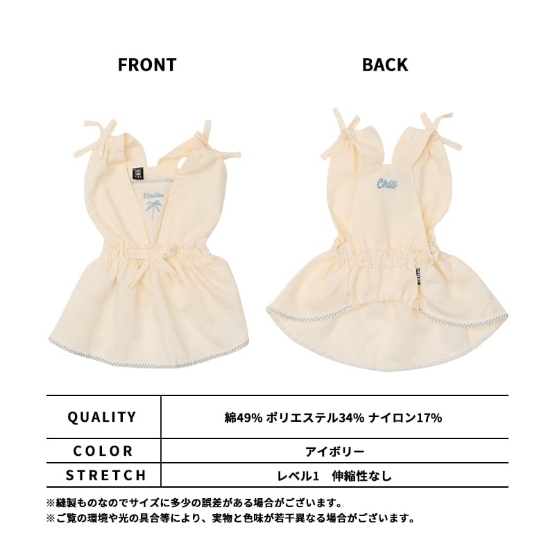 やわらかな生成り生地に映えるやさしいブルーの刺繍で、こなれた夏のリゾート感を演出♪デイリーにも特別なお出かけにも使いやすい、ワンピースタイプのお洋服(左)です。麻のような生地感は通気性もよく、見た目にも清涼感があります。背中にはヤシの木をさりげなくデザイン。ラフなタッチの刺繍が、カジュアルながらもしっかりとしたアクセントに。胸元の「Chill」刺繍で、どの角度から見ても可愛く決まるデザインに。正面からの見え方もばっちりです♪甘さをおさえたギャザーとシンプルなリボンが、やさしく上品な印象に。裾にあしらわれた同色クロスステッチも、おしゃれポイント♪ウエスト部分はゴム仕様でやさしくフィット。動いてもズレにくく、きれいなシルエットを保ってくれます。お腹周りにはゴムが入っているので、ストレスフリーな着用感です。ほどよいハリのある麻のような生地感は、着用時のシルエットをきれいに見せてくれます。さらりと軽い着心地で、暑い日も快適に過ごせます。※デリケートな生地です。お取り扱いにご注意ください。