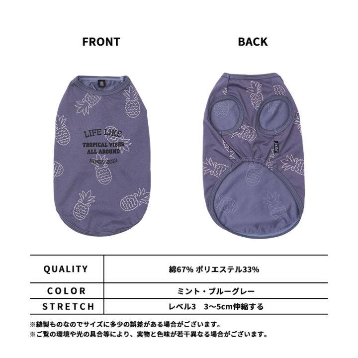 夏の定番パイナップル柄と、トレンドのカレッジロゴを組み合わせた、見た目にも涼しげなタンクタイプのお洋服です。落ち着いたブルーとの配色もおしゃれ♪ぷくっと立体感のあるロゴプリントがデザインのポイント。カジュアルながらも、上品で洗練された印象に仕上げました。接触冷感の綿生地を使用しています。さらりと軽い着心地で、ルームウェアとしても快適に過ごせる素材感です。ATTENTION:ロゴプリント部分が色落ちする可能性があります。お取り扱いにご注意ください。