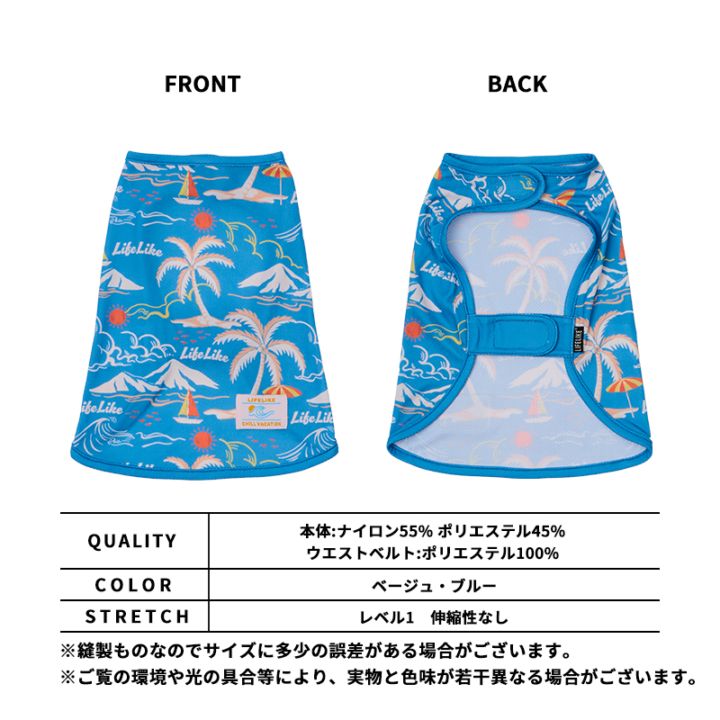 くすみカラーとレトロなアロハ柄がオシャレ!一枚で夏らしいヴィンテージスタイルを楽しめる、ポンチョタイプのお洋服です。カラフルなオリジナル織ネームがアクセントに。お洋服全体のデザインをさりげなく引き締めます。ポンチョタイプで着脱もスムーズ。かぶりタイプのお洋服が苦手なワンちゃんにもおすすめです♪ベルクロ部分には、毛が絡みにくい柔らかい素材を使用しています。水にぬらして振るだけで、ひんやり感が持続!