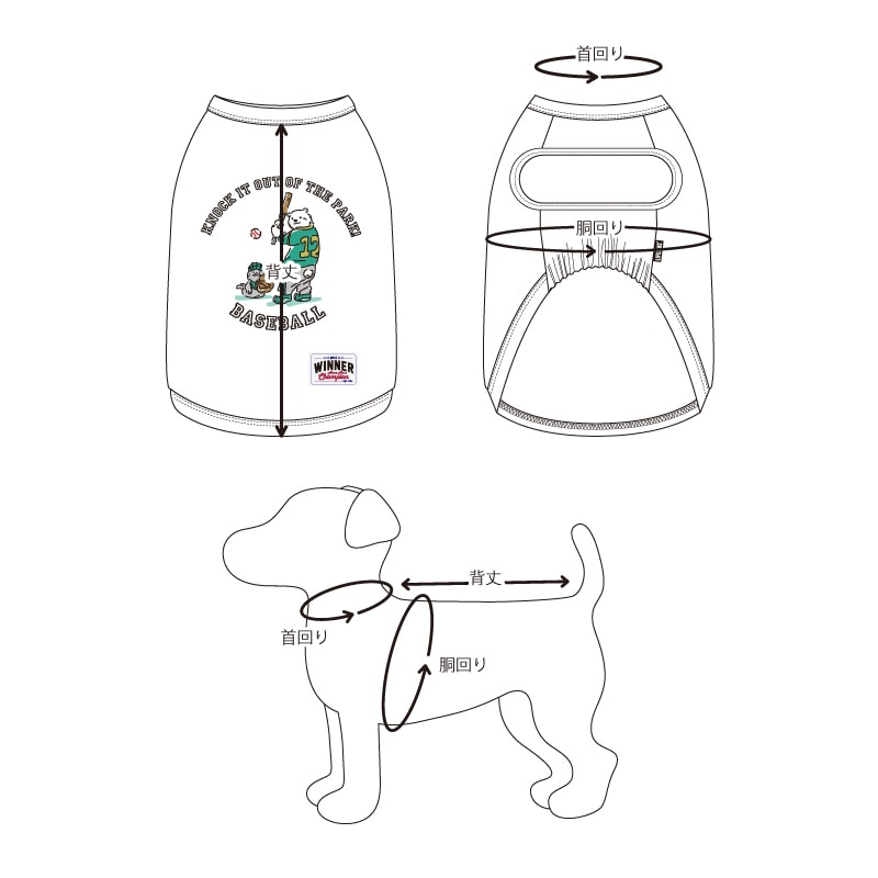 スポーツを楽しむシロクマのイラストが目を引く、タンクタイプのお洋服です。どこか懐かしさを感じるレトロなタッチと、シロクマと対決するチビクマくんにも注目♪裾にデザインされた「WINNER」の力強いオリジナル織りネームがアクセントに♪ベースボール・サッカー・バスケット・ラグビーの