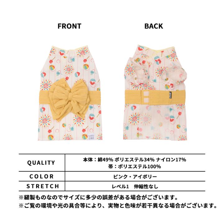 毎年大人気♪LIFELIKEの浴衣が今年も登場!キュートな夏祭りモチーフをふんだんに盛り込んだデザインは、思わず目を引く華やかな仕上がり。夏らしさたっぷりの一着です。存在感のある、ふんわりとした大きなリボン帯がとってもキュート♪後ろ姿まで可愛く決まる、華やかな高見えデザインです。お腹部分はベルクロ仕様で、簡単に着脱できます。清涼感のある薄手の麻ライク生地を使用。サラリとした着心地で、暑い日でも快適に過ごせます。※デリケートな生地です。お取り扱いにご注意ください。