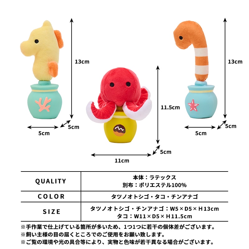 ラテックス✕ぬいぐるみの異素材ミックスで、飽きずに楽しめちゃう!ツボから顔を出す海のアイドルたちが、とってもキュートなおもちゃです。置いておくだけでも可愛い存在感は、インテリアアイテムとしても◎ツボ部分は笛入りのラテックス素材、いきもの部分はシャカシャカ音のするぬいぐるみ素材を使用しています。それぞれ違った噛み心地と音の変化で、ワンちゃんも大興奮!チンアナゴ、タツノオトシゴ、タコの3種類のモチーフ。ツボ部分には、それぞれヒトデ・サンゴ・タコ焼きのイラストがデザインされています。動物らしさを感じる短めのファー素材は、置いておくだけでもとってもキュート♪思わず全種類そろえたくなる可愛さです。小さく柔らかい商品です。誤飲の危険がありますので使用時には目を離さないでください。