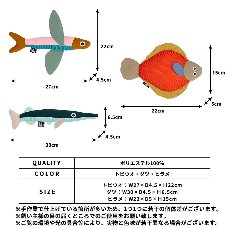 カラフルなカラーと愛らしい表情がとってもキュート!ふわふわな手触りが見た目にも楽しいアニマルトイです。大きなヒレが印象的な「トビウオ」に平らなフォルムがユニークな「ヒラメ」、細長いシルエットが特徴の「ダツ」の3種類。釣り好きな飼い主さんにもおすすめの、遊び心あふれるデザインです。シャカシャカ素材を使ったヒレと、押すとプープー音が鳴るお腹。2つの仕掛けで、ワンちゃんも飽きずに長く楽しめます♪耐久性に優れ、汚れが付きにくいリップストップ生地を使用。さらに、噛むことで歯が食い込みやすいメッシュ生地を組み合わせ、遊びながら歯磨き効果も期待できます。