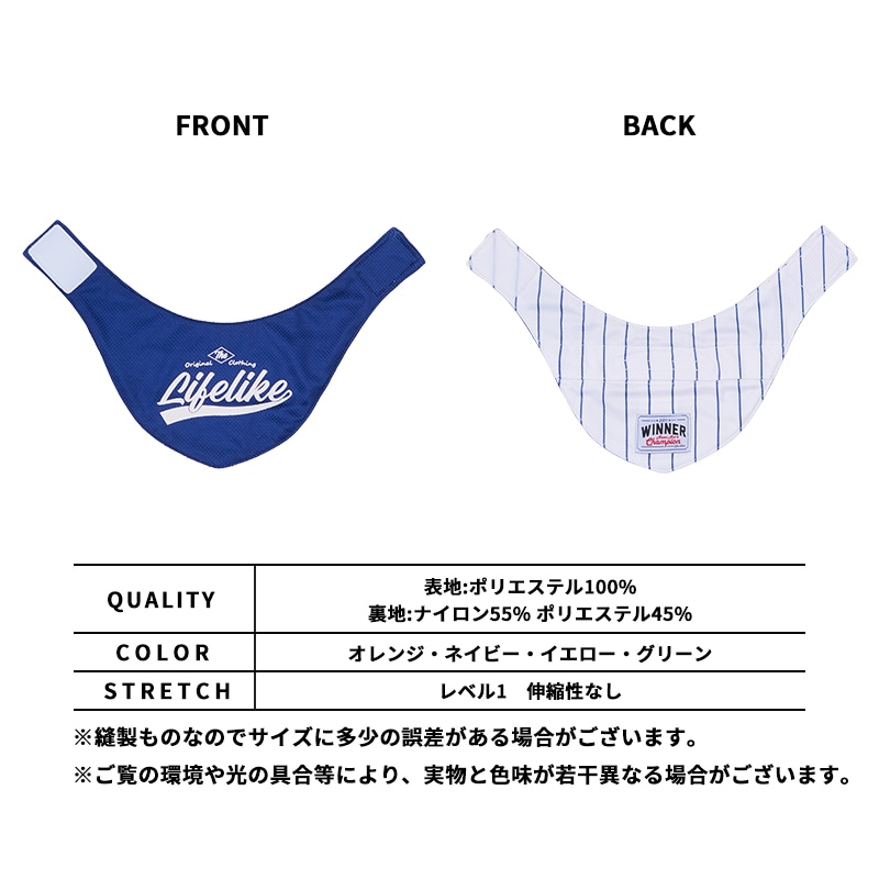 あなたの好きなチームカラーが見つかるかも!?カレッジロゴプリントが、元気でスポーティーな印象に。1枚でコーデが決まる、存在感のある冷感バンダナです。カレッジロゴとストライブ、どちらも楽しめるリバーシブル仕様になっています。その日の気分やコーデに合わせて選ぶのも楽しい♪ストライプ面にはカ強い「WINNER」のオリジナル織りネーム付き。裏面には保冷剤用ポケット付き。ライフライクの保冷剤はもちろんお手持ちの保冷剤入れても◎WETCOOLING✕保冷剤で、ひんやり感もアップ!※こちらの商品に保冷パックは付属していません。目の細かいメッシュ生地で通気性も抜群。毛が表面に飛び出る心配もなく、快適な着用感です。